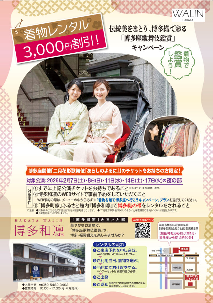 博多の町を、そして伝統ある歌舞伎の世界を、博多織の帯を締めた特別な装いで楽しんでみませんか? 皆さまからのご予約を心よりお待ちしております。